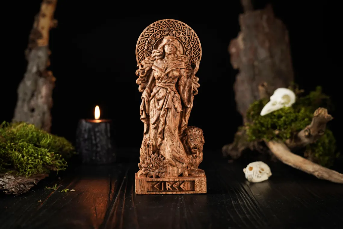 Taillée dans un bois noble, cette statue incarne la puissance ambivalente de la magicienne. Elle apporte une présence mystique et protectrice à votre espace de vie.